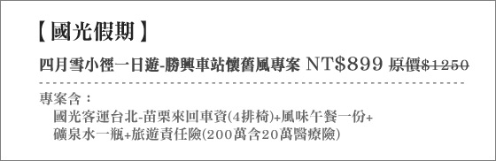 商品訊息簡述: 只要899元即可享有【國光假期】原價1250元奶貐楔p恕@日遊-勝興車站懷舊風專案:含國光客運台北-苗栗來回車票+風味午餐一份+礦泉水一瓶+旅遊責任險(200萬含20萬醫療險)!